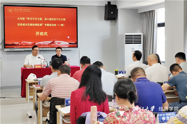 7月3日上午,大石街“学习千万工程,深入落实百千万工程促进城乡区域协调发展”专题培训班(一期)举行开班式。此次培训班由广州市番禺区大石街道委托,浙江大学经济学院承办,旨在通过系统培训,提升街大石道骨干的专业能力和综合素质,为实现大石街道城乡区域协调发展贡献力量。大石街道党工委副书记、街道办事处主任陈志刚,浙江大学经济学院高级培训中心副主任孙爱国出席开班式。